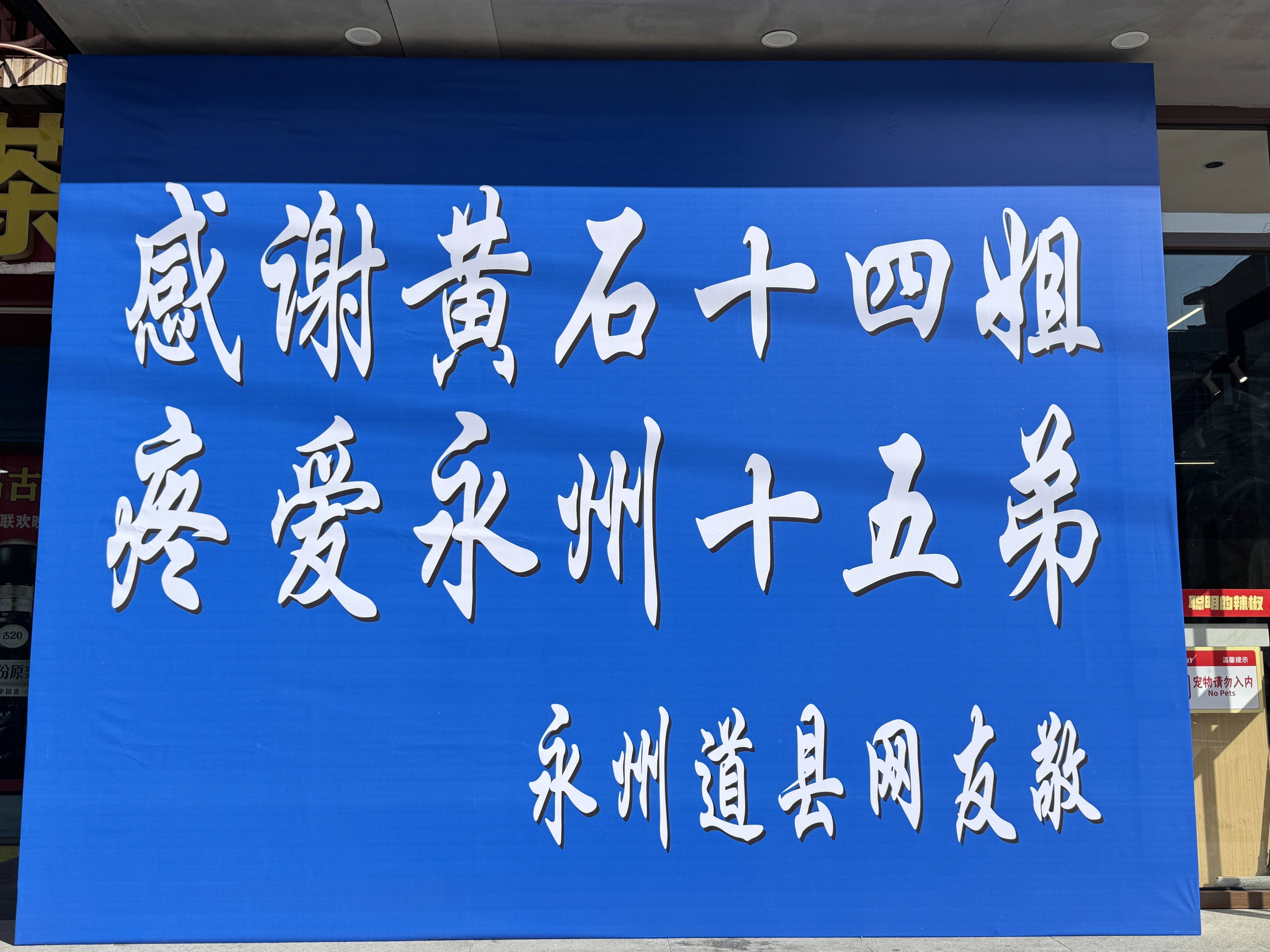 故事源于两位老友的“一拍即合”。湖南永州市道县的杨哥和他在阳新的生意伙伴张远强,在网上看到黄石“十四姐”和永州“十五弟”的梗后,杨哥当即萌生念头:“要在阳新立个牌,替家乡网友说声谢谢!”张远强一听,二话不说,立刻贡献出自家店门口最显眼的墙面:“安排!这面墙从此有使命了!”