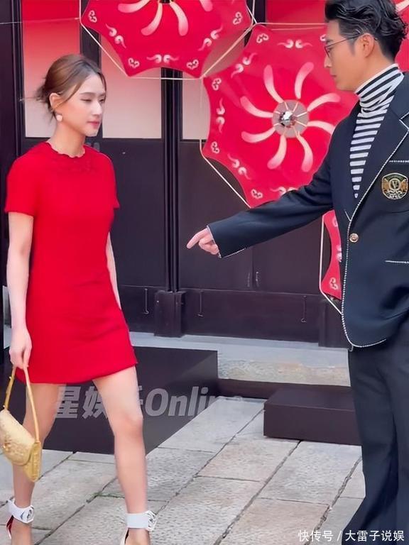 何超莲穿了条红色短裙,脚下踩着白色的高跟鞋,手里还提着个金黄色的手包。这身打扮嘛,说得好听点是复古,其实看着有点土,就像十几年前的风格一样。